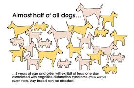 cognitive dysfunction include (but are not limited to): mood swings, decreased activity, decreased appetite, inability to recognize previously-familiar environments, surroundings or people, inappropriate elimination in the house, slow to respond, increased irritability, some level of blindness, and sometimes seizure-like activity.